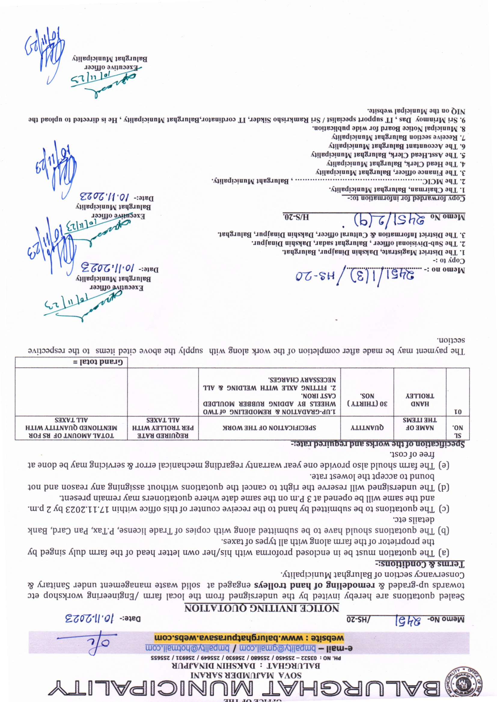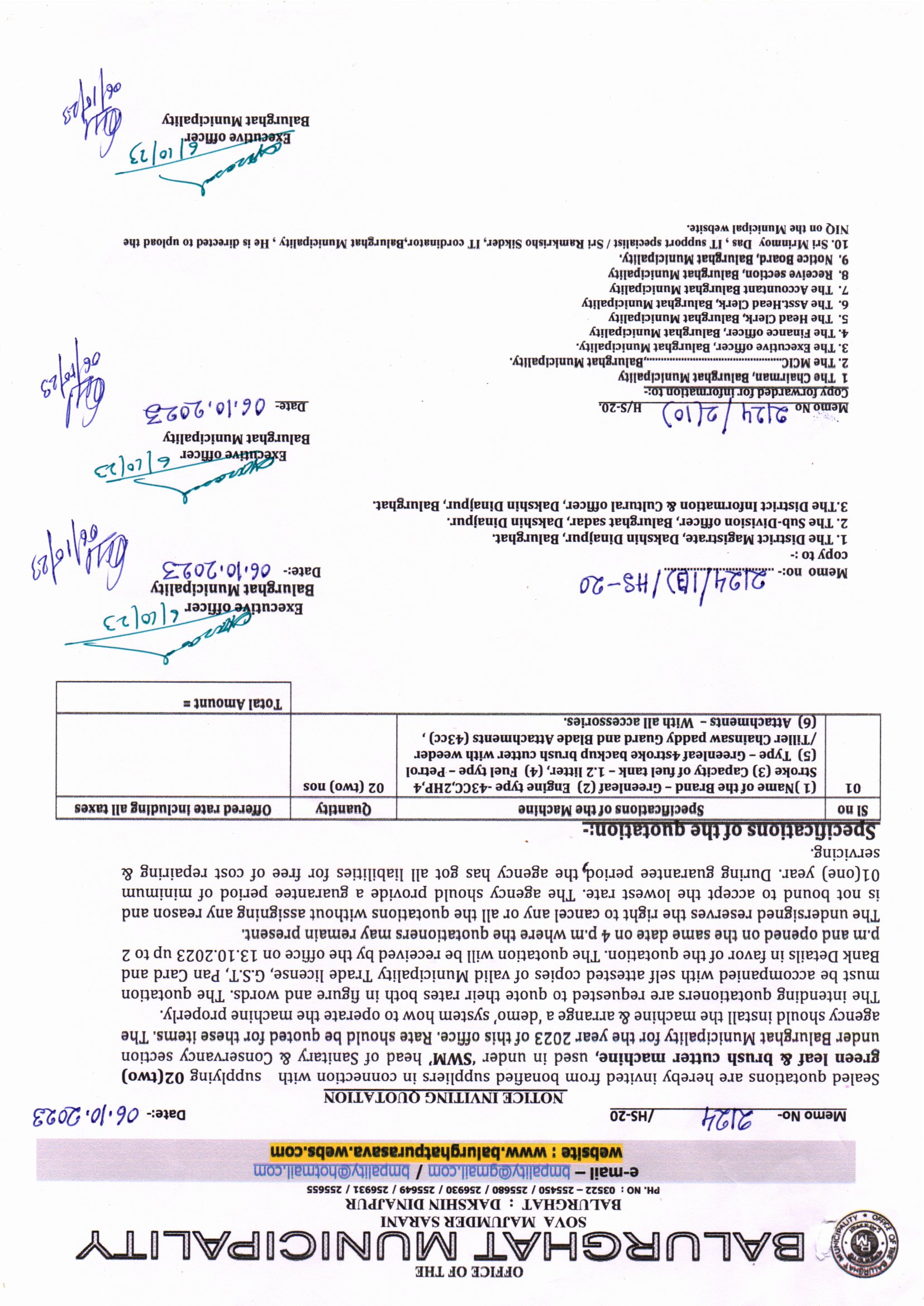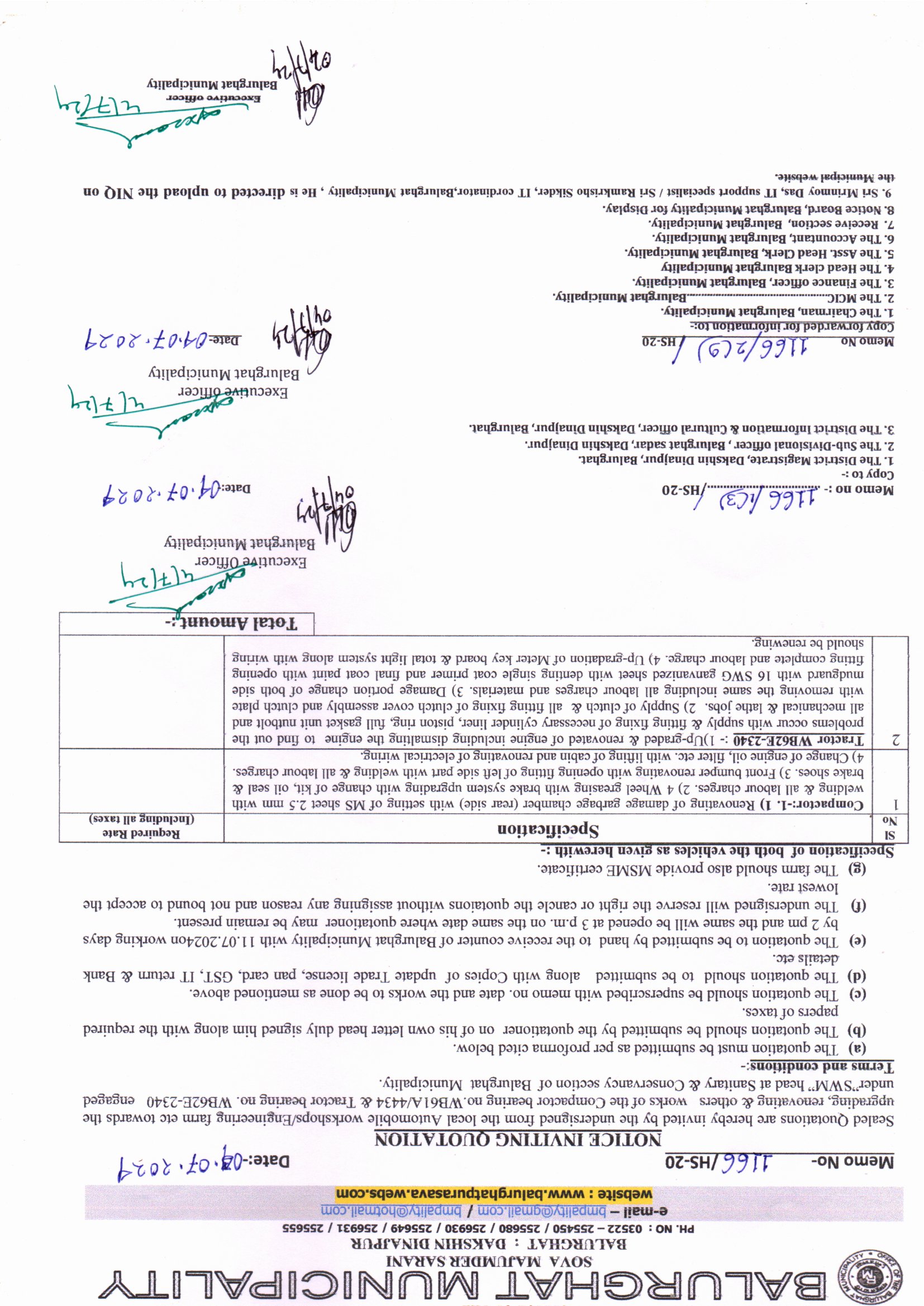 NIQ No. 5191/HS-20 Date. 23.02.2026 regarding renovating and upgrading of following works for the Compactor bearing No. WB61A/4434 engaged at Sanitary and conservancy Section under Balurghat Municipality.