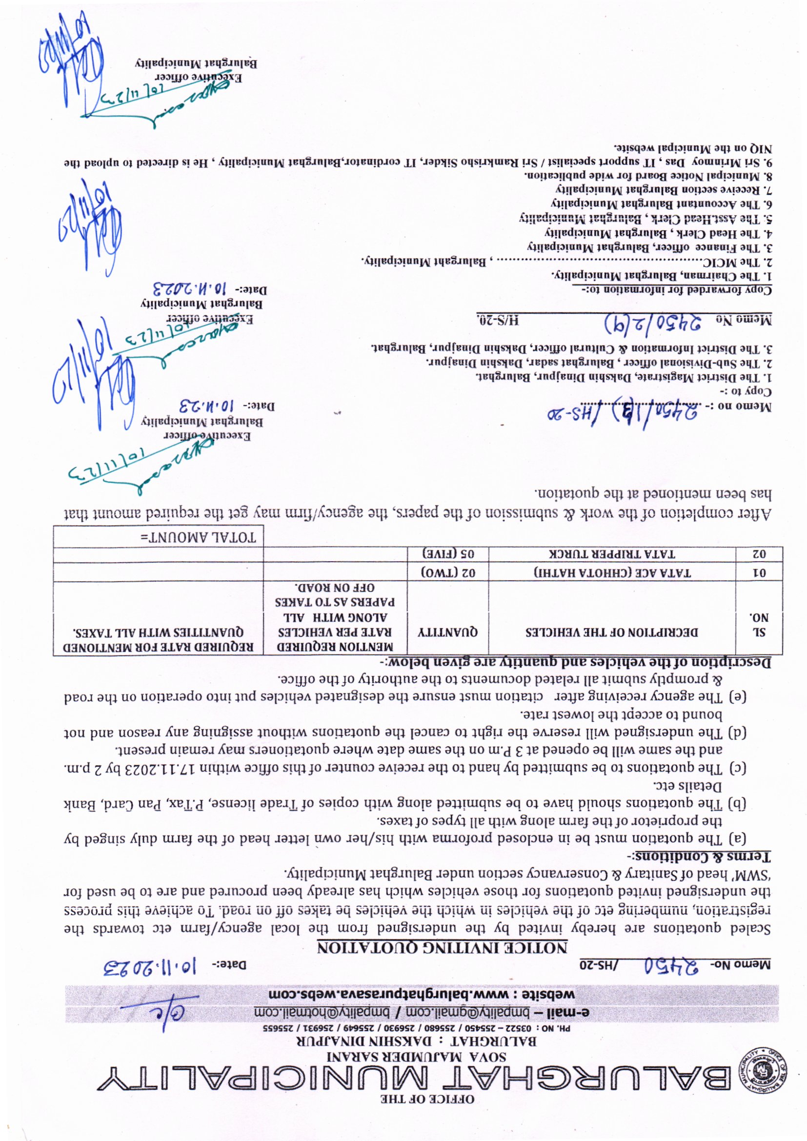 NIQ Memo No. 5450/HS-20 Date.11.03.2026 renovating and up-grading of following works of 3 nos vehicles (TATA ACE) bearing no. WB61B/8117, WB61B/5120 & WB61B/5122 engaged engaged at Sanitary & Conservancy Section under Balurghat Municipality
