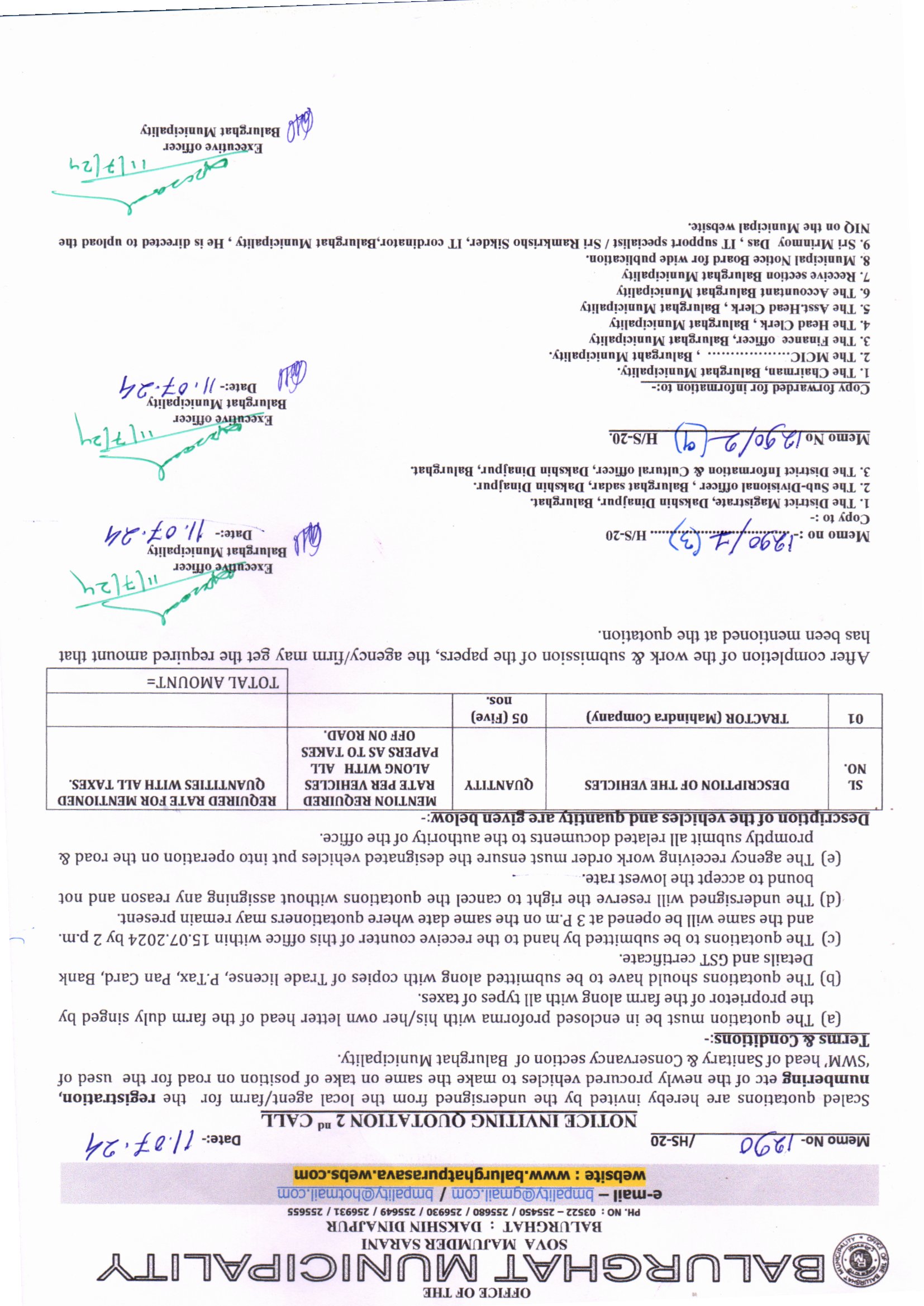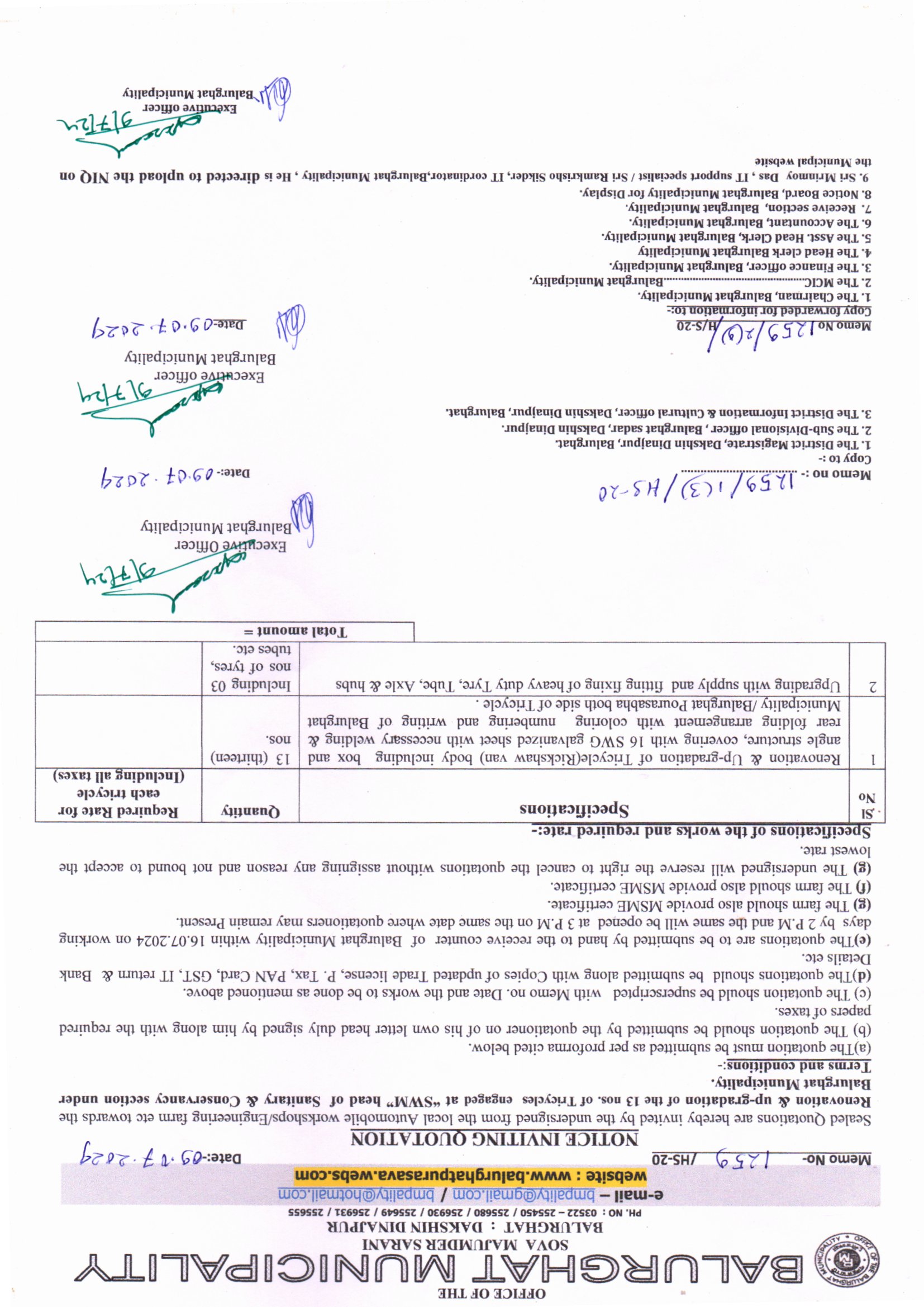 NIQ Memo No. 5449/HS-20 Date.11.03.2026 renovating and up-grading of following works of 3 nos vehicles (TATA ACE) bearing no. WB61B/8127, WB61B/5131 & WB61B/8143 engaged engaged at Sanitary & Conservancy Section under Balurghat Municipality