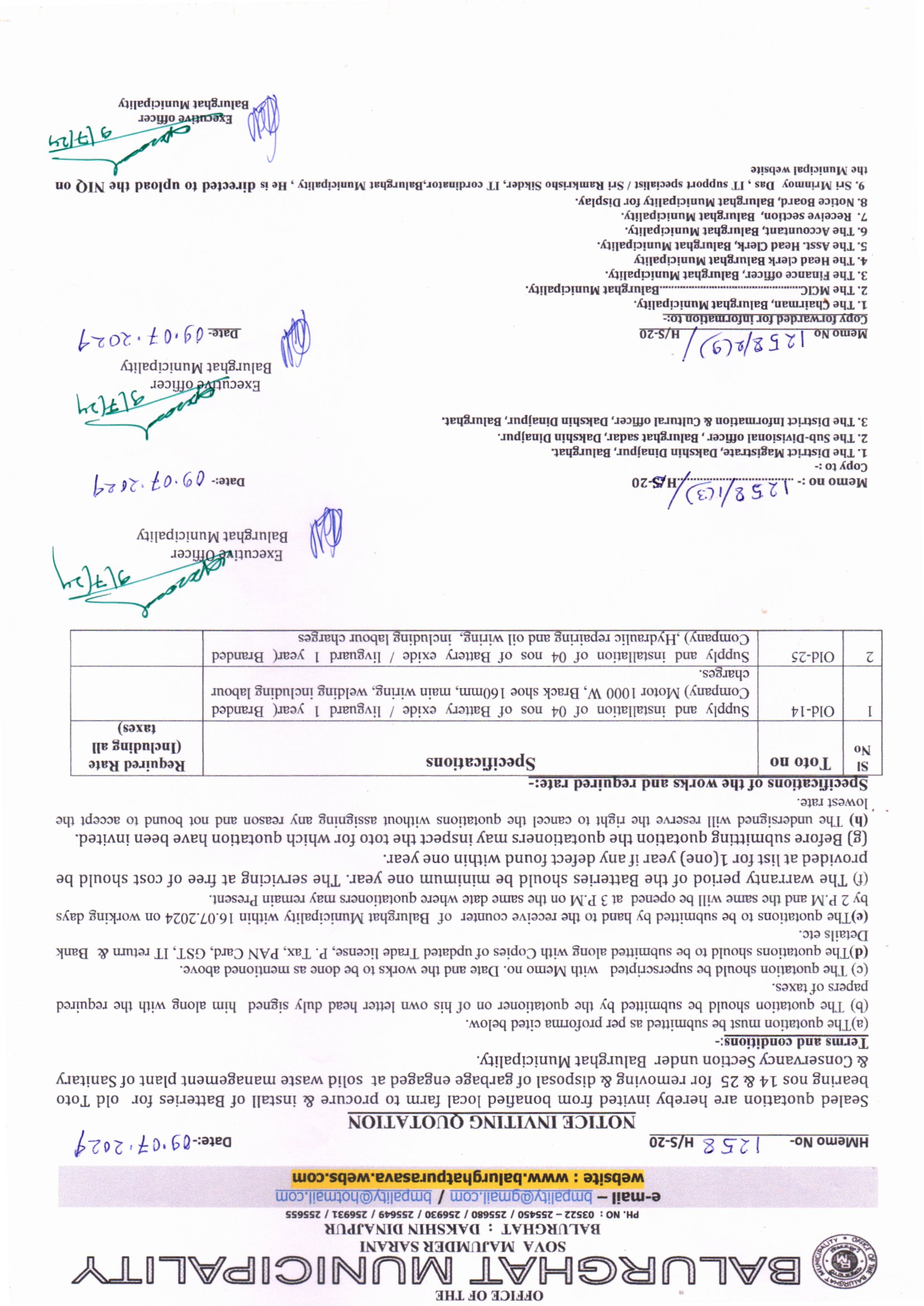 NIQ No. 5309/HS-20 Date. 05.03.2026 regarding Installation of 03 sets batteries each set consist of 04 nos. for the Toto bearing no. 15,16 & 24 engaged at SWM head under sanitary & Conservancy Section of Balurghat Municipality.