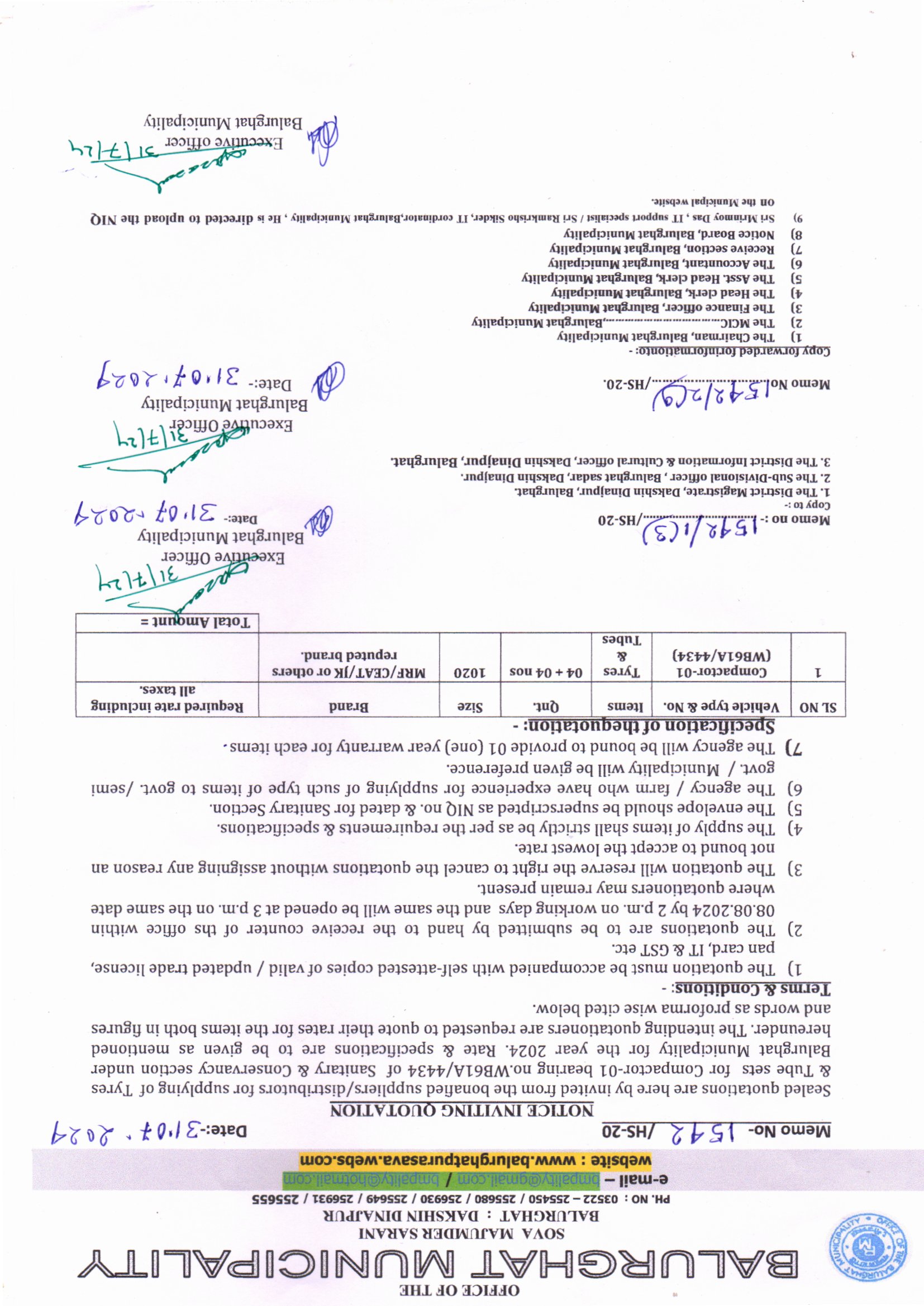 Memo No. 2075/HS-20 Dt. 04.09.2025 Procurement of vehicle parts at SWm Head under Balurghat Municipality