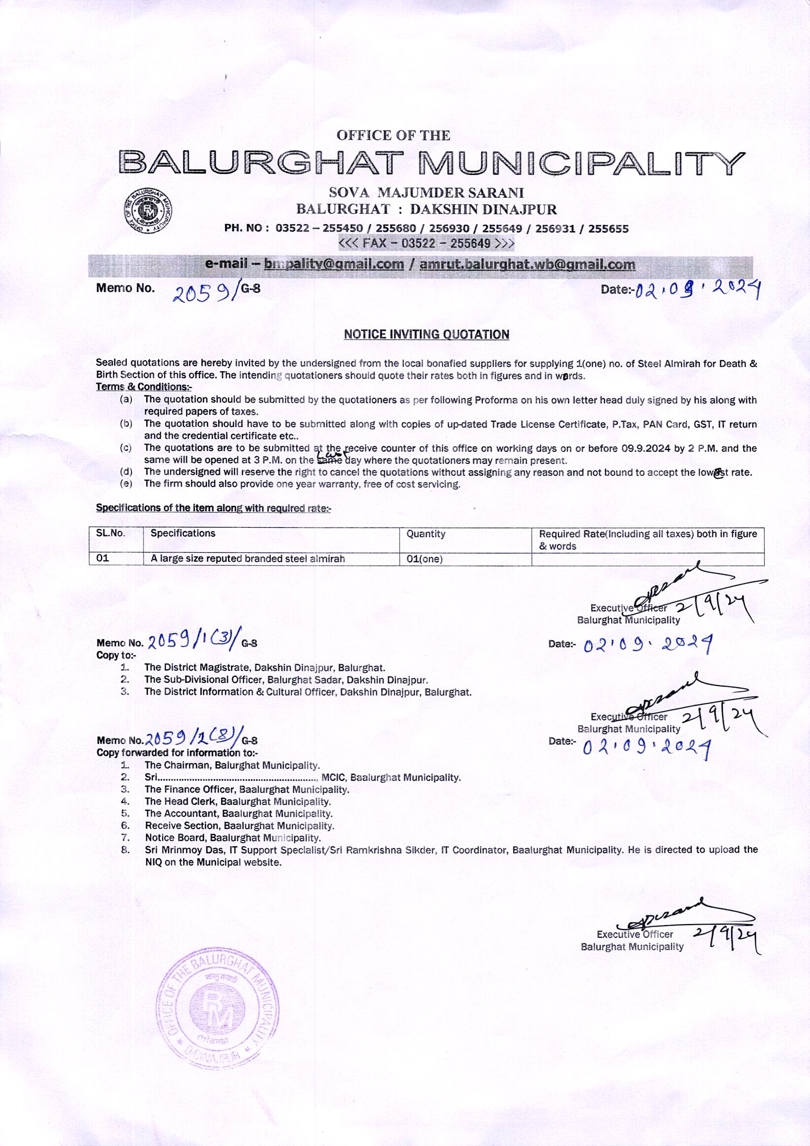 NIQ for supplying of two Nos. of Xerox Cum Printer for Sanitary and Conservancy Section and chamber of the Executive Officer, Balurghat Municipality
