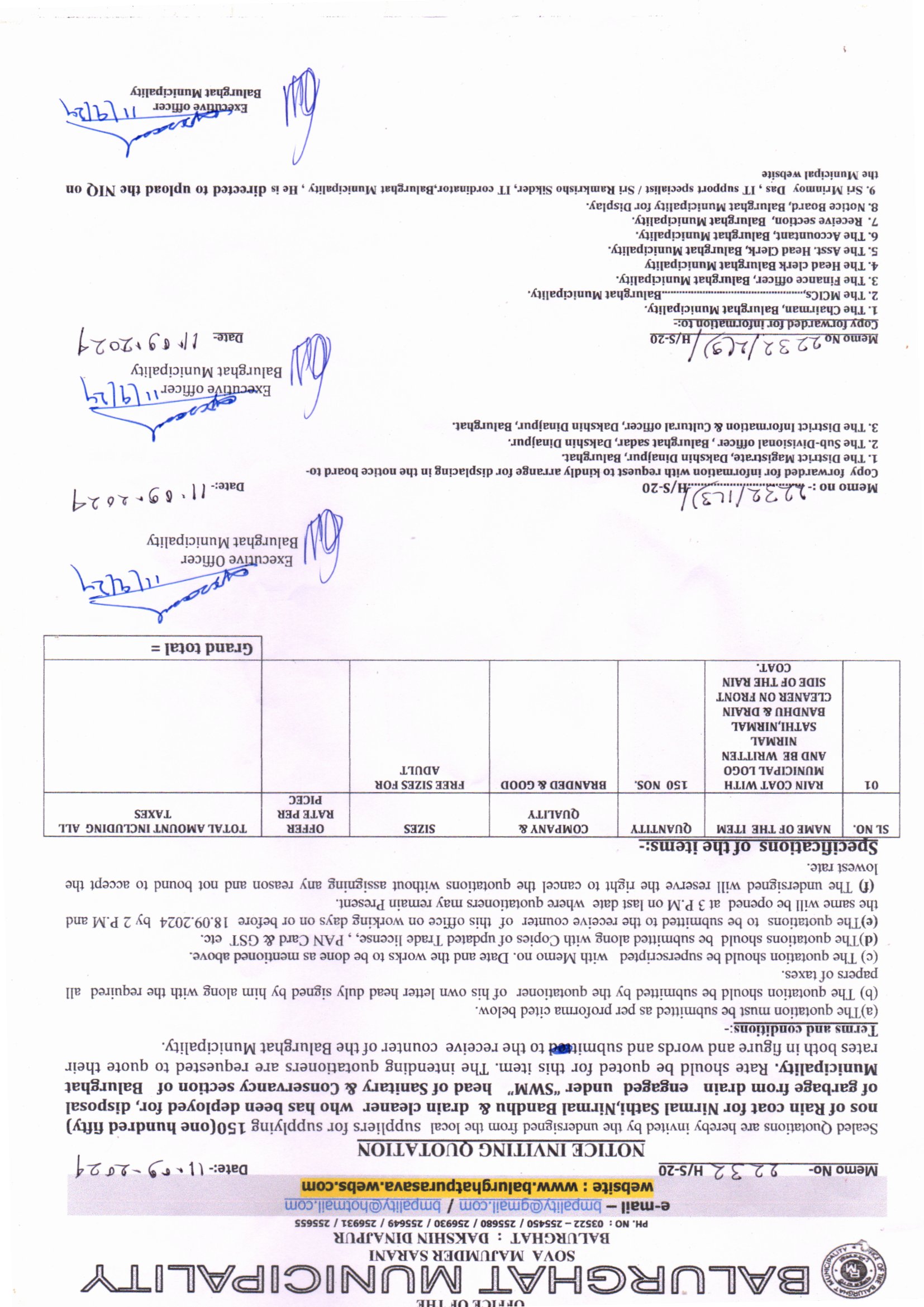 NIQ for Supplying of 150 Nos. of Rain Coat and Trouser for DRW staff who has been deployed for disposal of Garbage from Drain & Municipal area engaged under SWM head of Sanitary & Conservancy section of Balurghat Municipality.