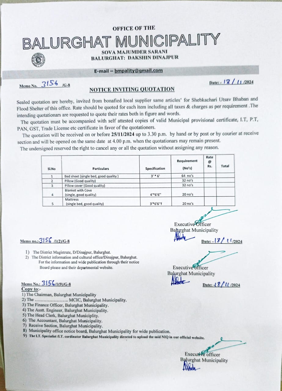 NIQ for Supply of Mentioned Articles, Balurghat Municipality
