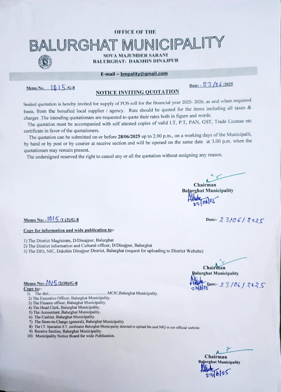 NIQ No. 3951/G-8 Date. 09.02.2026 Regarding Supply of Printing Articles under Balurghat Municipality.