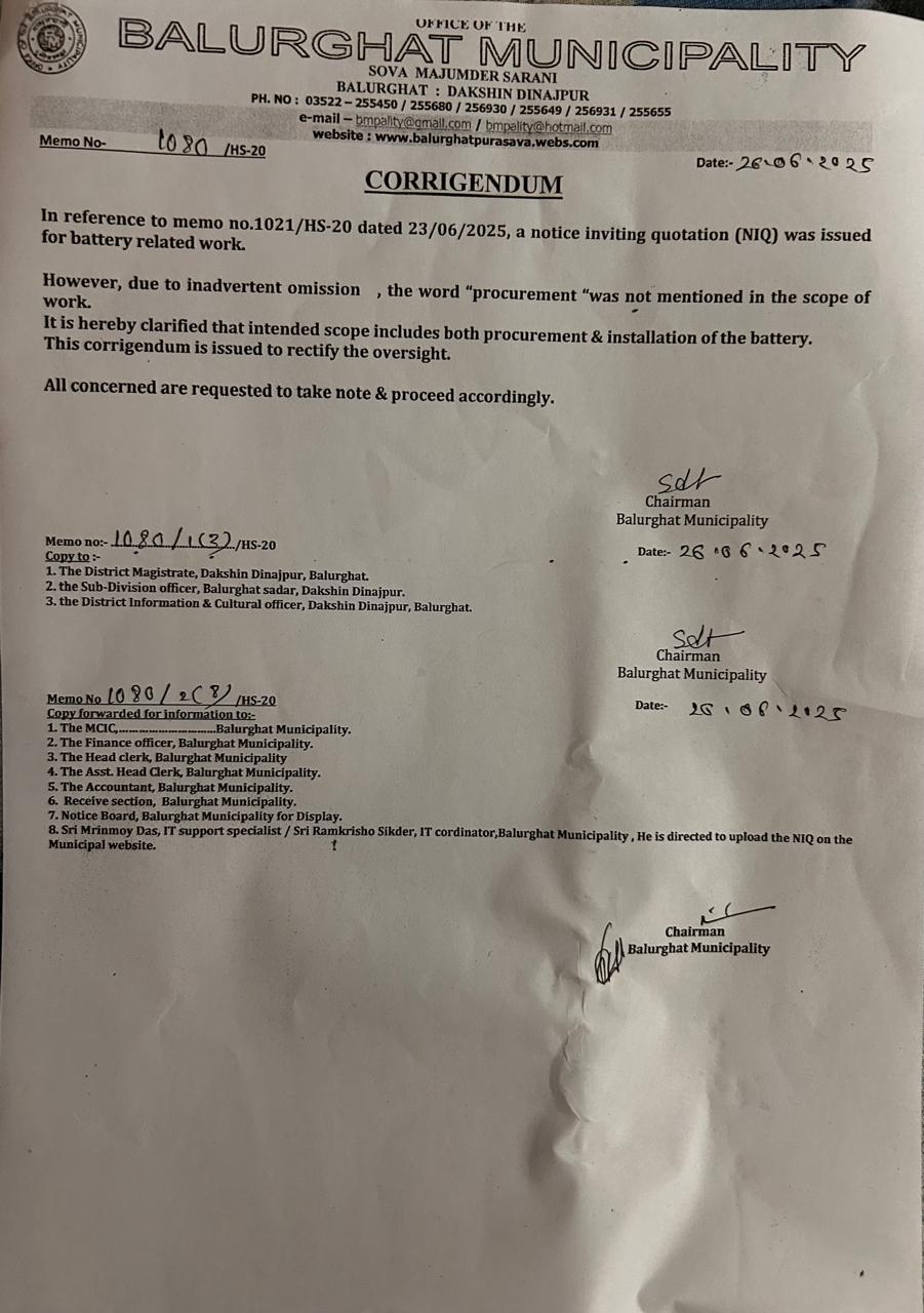 NIQ No. 5201/HS-20 Date. 24.02.2026 Regarding Installation of three sets batteries each set 4 nos for toto bearing no. 01.03 & 13 engaged SWM head under Balurghat Municipality.